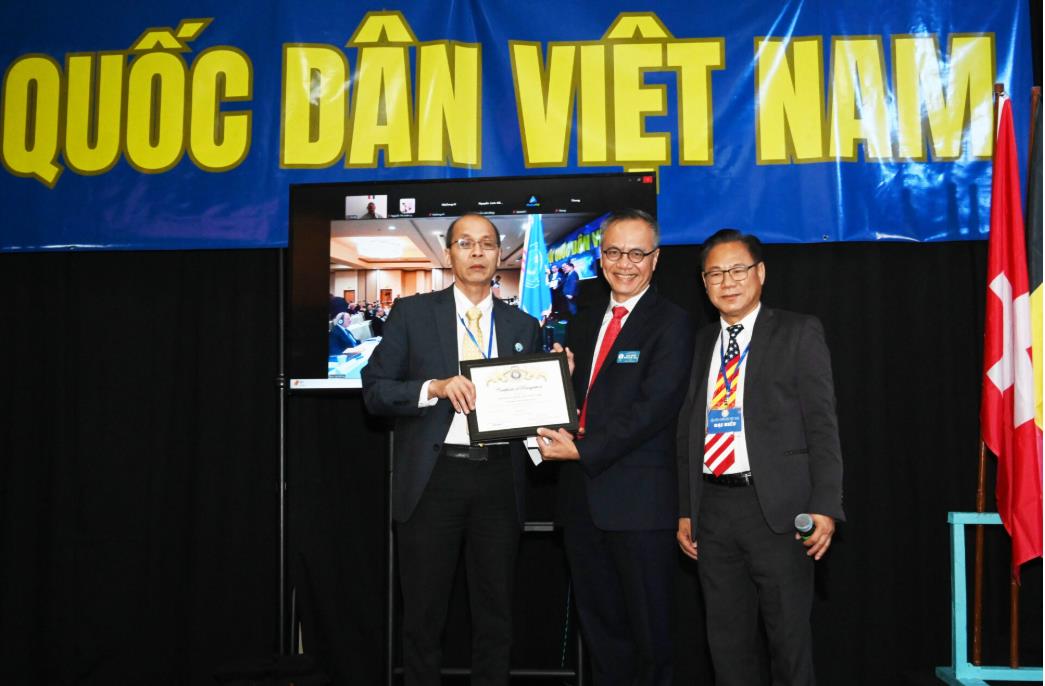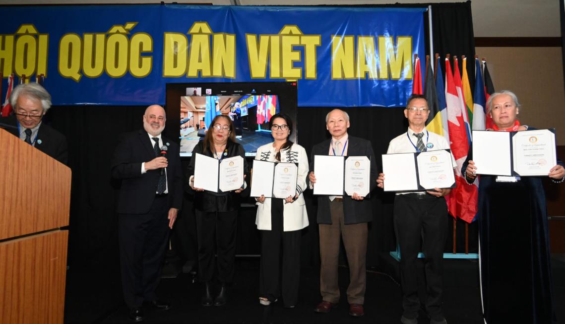 Một số diễn giả trong Đại Hội Quốc Dân Việt Nam nhận bằng khen từ ông David Gallup, chủ tịch Chính Phủ Công Dân Thế Giới. (Hình: Văn Lan/Người Việt)