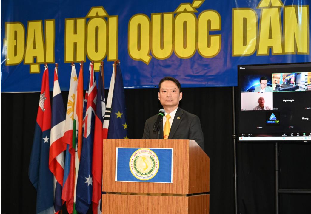 Dân Biểu Trí Tạ phát biểu tại Đại Hội Quốc Dân Việt Nam. (Hình: Văn Lan/Người Việt)
