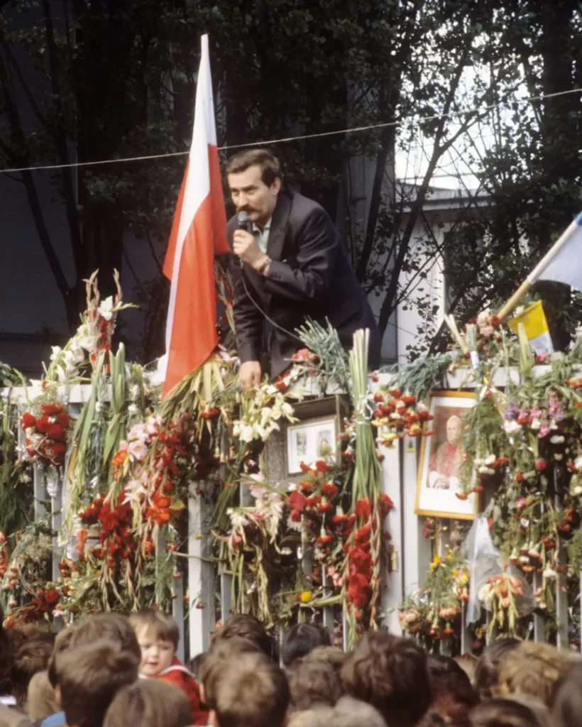 (Trong ảnh: Lech Wałęsa trong cuộc đình công tại xưởng đóng tàu Lênin, tháng 8 năm 1980.)