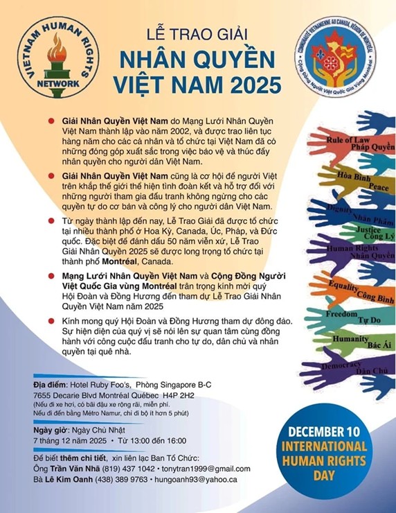 Lễ trao giải Nhân Quyền Việt Nam 2025 sẽ được tổ chức vào Chủ Nhật, ngày 7 tháng 12 năm 2025, từ 13:00 – 16:00, ở Montreal, Canada.