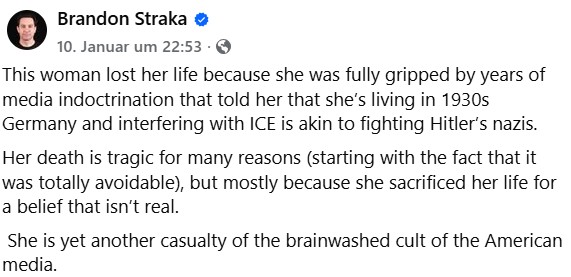 Bạn nghe không nhầm đâu: “Người phụ nữ đã mất mạng tự xưng là một nhà thơ đến từ Colorado, có ghi trong phần tiểu sử của bà ấy. Một phụ nữ da trắng 37 tuổi tên là Renee Good. Tờ Daily Mail cho biết bà ấy để lại một người bạn đời đồng tính nữ và một đứa con từ cuộc hôn nhân trước. Bà ấy là một người gây rối, mặc dù bà ấy tự coi mình là một người quan sát pháp lý. Nhưng không có bằng chứng nào cho thấy bà ấy có bằng luật.”