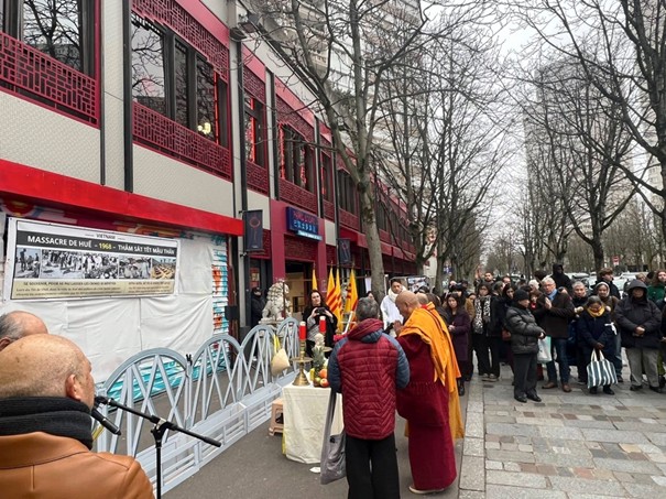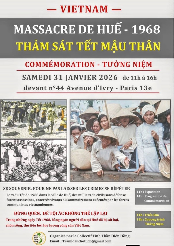 Thứ bảy 31/1/2026, ngay trung tâm khu Châu Á ở quận 13 – Paris, cộng đồng người Việt tị nạn cộng sản đã tổ chức một buổi tưởng niệm trang nghiêm và thành kính cho các nạn nhân trong biến cố Tết Mậu Thân 1968, đặc biệt là thảm sát tại Huế. Trời Paris lạnh, cây trụi lá, mặt phố xám mờ sương; nhưng trước số 44 Avenue d’Ivry, những lá cờ vàng xen trong đám đông như nhắc rằng có những ký ức không thể bị phủ bằng thời tiết, bằng năm tháng, hay bằng sự lãng quên.